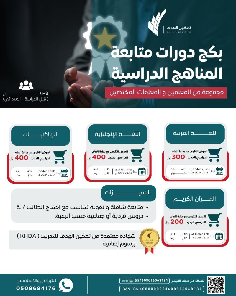 -شهادة معتمدة من تمكين الهدف للتدريب(KHDA)برسوم إضافية.