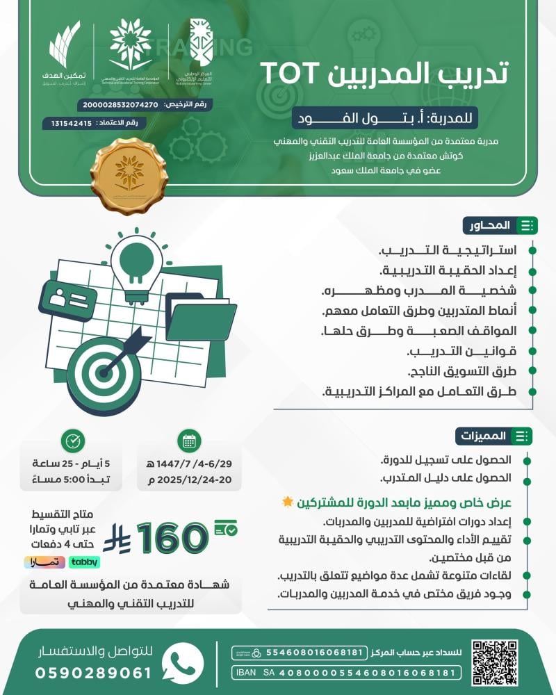 تمكين الهدف لتسويق التدريب والخدمات الإدارية، في عصر التنوّع وارتفاع الذائقة الفكرية والمهارية والبصرية، نؤمن بأن التسويق الذكي مزيجُ خبرةٍ وذكاءٍ ولمساتٍ وفنٍّ، لذا نحن هنا في خدمتكم.